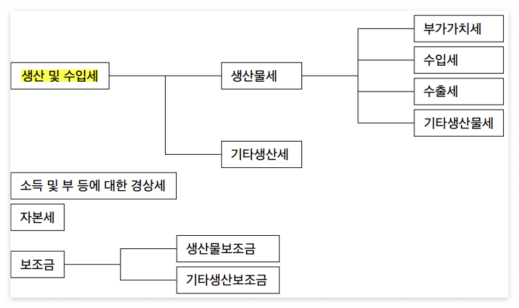 마지막으로, 국민계정체계에서는 조세의 실질적인 부담주체를 결정하기가 어려운 점 등을 고려하여 간접세와 직접세 대신 다른 용어를 사용하는데, 이에는 생산 및 수입세, 소득 및 재산에 대한 경상세, 자본세 등이 포함됩니다. 아래의 그림으로 확인하시면 이해가 더 쉬우실 거예요.